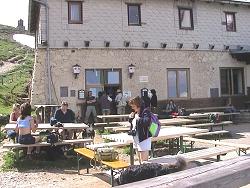 | Noch ein Stück weiter, dann noch eines, zum Schluß haben wir es dann doch geschafft und gießen uns an der Hütte unterhalb des Gipfels und beim großen Sendeturm des ORF ein Radler hinter die Binde. Dann erklimmen wir noch die letzten paar Meter und können trotz diesigen Wetters einen wunderschönen Ausblick in 2176m Höhe genießen. Viel Zeit bleibt uns jedoch nicht denn wir müssen ja nach 3 Stunden Aufstieg auch wieder hinunter. Also noch eine Jausenplatte mit Brot, Käse, Speck und Wurst einverleibt (zu Zweit!), noch einen Radler bzw. einen Kaffee und dann geht’s wieder runter. Wir sind auf dem Weg die letzten an dem Tag, es beginnt leicht zu dämmern und die Berge werden in tolles Abendlicht getaucht. Der Weg hinunter ist weniger beschwerlich aber auch nicht ganz ohne. Auf dem Geröll rutscht man schnell aus wenn man nicht aufpaßt. Als dann hinter uns eine tiefdunkle Wolkenwand aufzieht und wie an einem Gedenkstein eines jungen Mannes vorbeikommen der an dieser Stelle genau vor 25Jahren und 1 Tag vom Blitz erschlagen wurde, treibt uns das noch etwas zusätzlich an und schon nach einer Stunde sind wir wieder am Wagen, keine Minute zu spät denn es treffen uns die ersten, dicken Tropfen. Die Rückfahrt zum Campground zieht sich dann auch noch in die Länge und als wir den Platz erreichen ist es schon kurz vor 21 Uhr. Bei einem Italiener, dessen Lokal sich „Don Quichote“ nennt, werfen wir noch etwas Grünzeug mit Joghurt-Kernöl-Dressing ein und fallen ziemlich erschlagen ins Bett. Ein Yeti haben wir nicht gesehen, auch den Reinhold nicht. | |