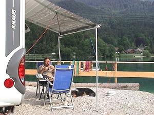 27. Juni 2004 Monika hat sich über das Waschhaus beschwert. Als sie spät abends noch einmal dort hinging, gab es kein Licht mehr (was dann bis zur Abreise so blieb). Die ADAC-Auszeichnung, denen wir sowieso skeptisch gegenüberstehen, stammt auch schon von 1997 und inzwischen müßte ein so extrem hoch gelobter Platz wieder mal ein klein wenig unternehmen. Manches ist bei näherem Hinsehen doch schon ein wenig verschlissen. (Auch die Freundlichkeit der Frau an der Rezeption) Als „erster DCC Europapreisträger“ und „Bester Campingplatz Österreichs“ sollten z.B. die meisten Stellplätze wenigstens soweit eben sein, daß man ein RV mit Hilfe einfacher Unterlegkeile waagerecht aufstellen kann. Wir hatten uns beim ersten Versuch einen Platz ausgesucht, bei dem das absolut unmöglich war, so mußten wir den Stellplatz wechseln und das ganze an der Rezeption wieder ummelden usw. usf. Alleine wegen des Baustellen-Lärms würde der Platz von mir keine Supernote bekommen. Am Waschhaus werden neue Gehwegplatten verlegt und eine Treppe angelegt, dazu braucht man 5 ständig brüllende Bauarbeiter und vor allem laute Baumaschinen wie Rüttler, Radlader, Stromerzeuger, Bohrhämmer..... |