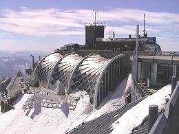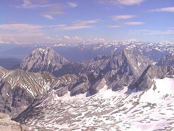 | Obwohl die Zugspitze so nah erscheint, ist sie jedoch über die Straßen ziemlich weit entfernt, die Berge sind nun mal ein ganz schön großes Hindernis. Erst nach 313km erreichen wir den Parkplatz am Eibsee, also der Talstation der Zugspitzbahn um 15:00Uhr. Boah, die Brüder haben die Preise seit 2000 gewaltig nach oben geschraubt. Damals hatte eine Fahrt für einen Erwachsenen noch 69DM (ca. 34€) gekostet, heute sind 43€ fällig, der Hund, der immer schon auf den größten „Haufen“ pinkeln wollte, darf das aber immerhin schon für 2€. Da wundert man sich vielerorts über die „Unlust“ der Verbraucher?? Die haben einfach das Geld nicht mehr dafür und bald wirds dort oben nur noch Japaner geben! Oben angekommen und die letzten Stufen zur Aussichtsplattform im Galopp genommen, haut’s uns fast die Füße weg. Die dünne Luft da oben und die schnelle Auffahrt, die ja nur 10 Minuten dauert, machen sich bemerkbar. Also erst mal tief Luft holen und „langsam tun“. Zwei mit Turnschuhen und Shorts "ausgezeichnet ausgerüstete" Party-People, natürlich ungesichert, müssen den kurzen aber nicht ungefährlichen, schmalen Weg über den verschneiten Grat zum Gipfelkreuz unterhalb der Aussichtsplattform machen. | |
