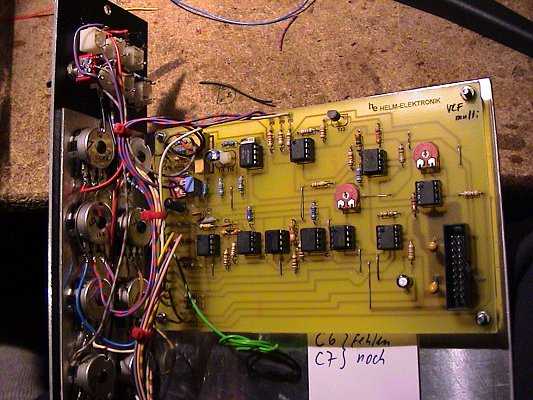 die die Firma Helm mitschickt beachtet werden. Eine "Falle" sind die Transistoren denn der Bestückungsaufdruck stimmt zwar was die Bezeichnungen E B C angeht, die Bohrungen passen aber nicht. Man muss also das Basis-Beinchen verbiegen damit sie passen und darf sich nicht auf die äussere Form beim Aufdruck verlassen. Also auf das Schaltbild achten! Unschön auch ein weiterer Fehler: Es gibt gleich zwei Widerstände mit der Bezeichnung R14, einer der beiden müsste R41 heißen. Da beide den gleichen Wert haben (1 K) macht das zwar nichts, man sucht sich aber "kaputt". Nach dem kompletten Aufbau habe ich mir zunächst habe die Kurvenformen angesehen und festgestellt, dass die Rechteck-Kurve fehlte. Es stellte sich heraus, dass ich den Kondensator C11, der am Rand der Platine sitzt wohl etwas bewegt hatte. Dadurch riss er gleich das Lötauge raus und es gab eine Unterbrechung die ich mit einem Drähtchen flickte. Besser man fixiert diesen Elko mit etwas Wachs, Silikon oder einem Tröpchen Heißkleber denn man stößt leicht wieder an ihn ran. (siehe Detailbild) Abgleich: Ein Teil des Abgleichs wird schon durchgeführt, bevor die Platine fertig bestückt und alles andere angeschlossen wird. Dies darf man nicht vergessen weil es später nur sehr umständlich wäre. Der entsprechende Trimmer sollte mit einem Lacktröpfchen gesichert werden. Als erstes schaute ich mir den Sägezahn an der eine Amplitude von 4V pp aufweist. IMo etwas wenig, in einem idealen System wären das 10Volt! Ich stellte dann die Pegel der anderen Kurvenformen gleich ein und korrigierte die Wellenformen. Den Abgleich der 1V/Oktave werde ich später machen. (und berichten°) . Mehr zum Abgleich weiter unten Bewertung: Nur ca 4V pp als Pegel erscheinen mir wenig, damit ist der Einsatz als Modulationsquelle eingeschränkt. Auch fällt auf, dass das Sinus nicht sauber ist. Bei bestimmten Modulationen für die man speziell Sinus als obertonfreies "Signal" braucht, wird es wohl unsaubere Ergebnisse bedeuten. Ebenfalls ungünstig ist der Arbeitsbereich der Pulsweitenregelung. Der Regler reagiert heftig und schon nach jeweils der Hälfte des Reglerwegs aus der Mittellage heraus bricht die Schwingung schon ab. Der Aufdruck auf der Frontplatte ist beim PW-Regler nicht aussagekräftig. Dort sollte eine Skala mit einem Mittelwert und "+" sowie "-" -Angaben zu sehen sein. Der Regler gehört in der "Normalstellung" auf die Mitte, auf "Null" (= Rechteck 50:50) |