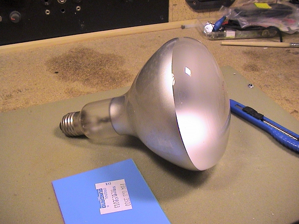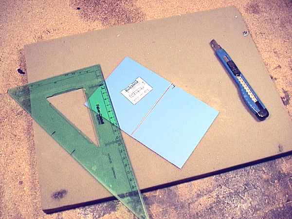 Zuerst schneide ich die Platinen zu. Dazu ritze ich sie kräftig, mehrere Male mit einem Cuttermesser ein und breche sie dann vorsichtig über die Tischkante. (die Schutzfolie dabei immer nach oben) (links) Dann schraube ich die Speziallampe (rechts)in meine Werkstattleuchte. Dann heißt es mit dem Licht