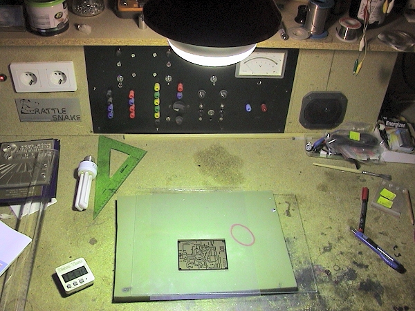 bei unterschiedlichem Rohmaterial anders. Ich arbeite am P.S.: Die Glasplatte sollte nicht so fleckig sein wie auf dem Foto ganz links und die Folie sollte man auch richtig herum auflegen. Das ich die Platine spiegelverkehrt herstellte merkte ich vor lauter Fotografieren erst als ich sie bestücken wollte und genauer hinsah. Also Schrott produziert! ;) |