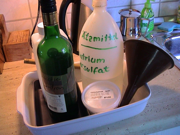 Die belichtete Platine lege ich in einen Katalog oder in eine verschlossene Schachtel und begebe mich in die Küche. Nun wird's chemisch und ätzend, also mit Bedacht arbeiten und möglichst alleine. Zum entwickeln der Platine, dabei wird der Fotolack auf den belichteten Flächen abgelöst, setzt man 5 Gramm Natriumhydroxid (NaOH, Ätznatron) in 500ml kaltem Wasser an. Am besten eignet sich dazu eine Keramikschale die NUR für diese Zwecke reserviert bleibt. |