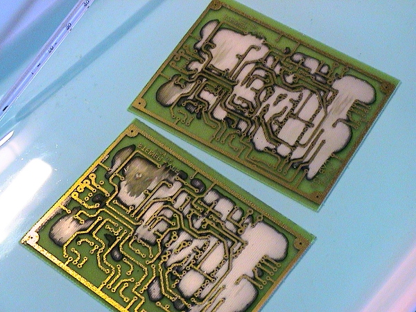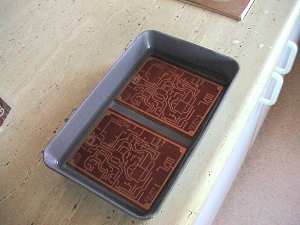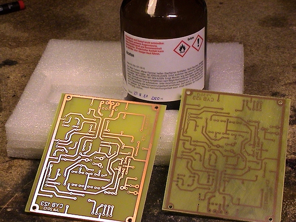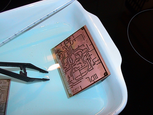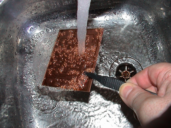 Der Ätzvorgang lässt sich optimieren wenn man die Schale immer kippelt damit immer frisches Ätzmittel über die Fläche strömt. Ganz gut ist es, wenn man immer wieder Luft an die Oberfläche lässt.. Alles fertig? Nun die Platine abspülen und abtrocknen, dann die Küche aufräumen. |