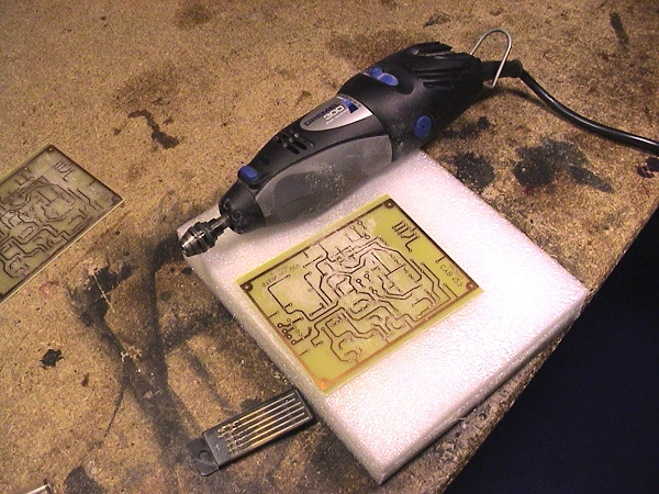 Platine mit einer Minibohrmaschine "frei Hand". Dazu schaue