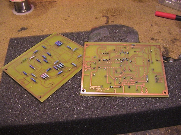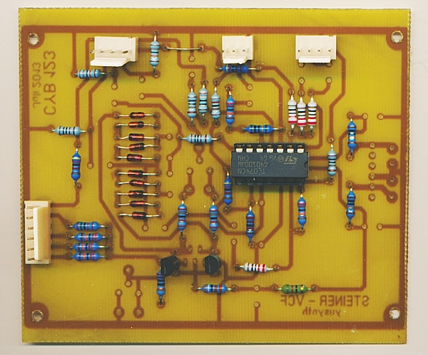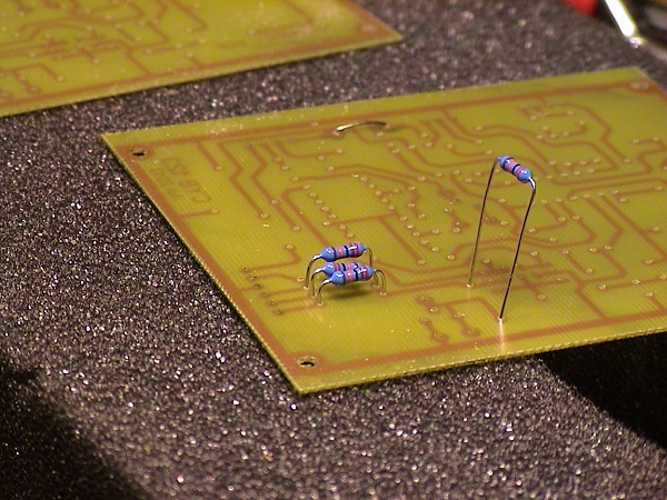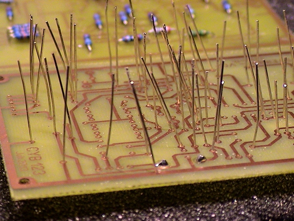 definitiv keine Durchmesser für einen Wanddurchbruch! Nach dem Bohren säubere ich die Platine auf Ober- und Unterseite gründlich indem ich mit Aceton die restlichen Lackschichten entferne. Wenn die Platine nicht noch Wochen herumliegt bevor sie bestückt wird, braucht man sie auch nicht mit Lötlack oder anderem "Zeug" zu beschichten. Zum Bestücken gibt es nicht so viel zu sagen, mit den flachsten Bauteilen anfangen, mit Drahtbrücken, dann Widerstände, Dioden usw. Ich stecke immer alle Bauteile einer Kategorie und das macht sich mit dem Schaumstoff "unten drunter" sehr gut. |