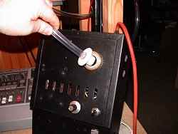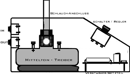 Inzwischen habe ich mir wieder eine zusammengeschraubt, eine aktive sogar. Zugegeben, sie ist nicht schön, ich habe einfach ein herumliegendes Gehäuse benutzt und dort den Treiber, den Netztransformator und einen 30 Watt Verstärkerbaustein eingebaut. Am Gehäuse befindet sich nur ein Laustärke-Poti und ein Fußschalter, der Eingang und auch ein Ausgang an dem das Eingangssignal unverändert anliegt. Ich bin zwischendurch mal zu unserem "Dorfschmied" gegangen. Dort bekam ich passende Schraubringe um den Treiber am Gehäuse zu befestigen. Auch das kleine Kunststoffteil mit dem man den Schlauch sehr bequem einstecken kann, stammt von ihm. Wir haben es auf seiner Drehbank angefertigt. Natürlich tut es ein Gummistopfen aus der Apotheke genauso gut. Aufpassen, dass nichts in den Treiber fällt, also immer das Loch verschließen! Soderle, und zum Schluss noch 20 Sekunden zum anhören in MP3-Streaming:
