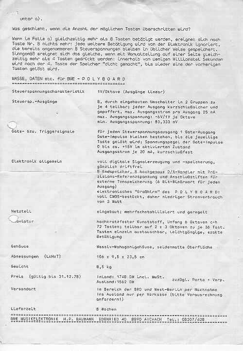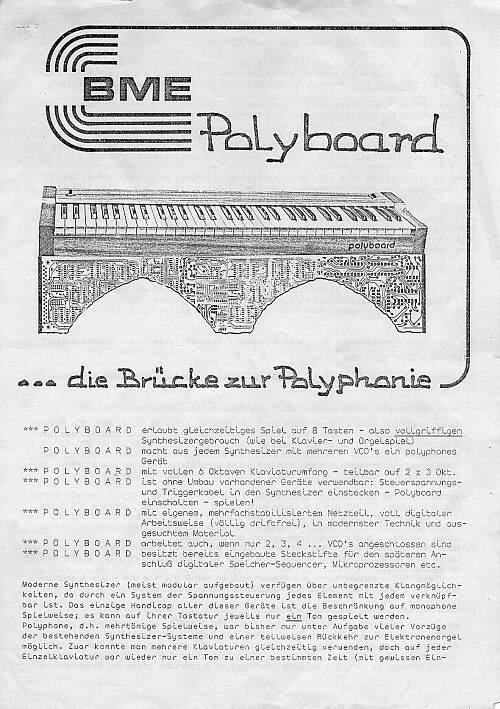 1979: BME POLYBOARD >>>>>>> Untätige Zeit, sowas gab es bei BME nicht. Bei Peter musste der Kopf von morgens bis abends rauchen und so entwickelte er "mal eben zwischendurch" ein Polyphones Keyboard, baute mal hier und da Geräte nach Sonderwünschen und und...... (klicken zum Vergrößern) |