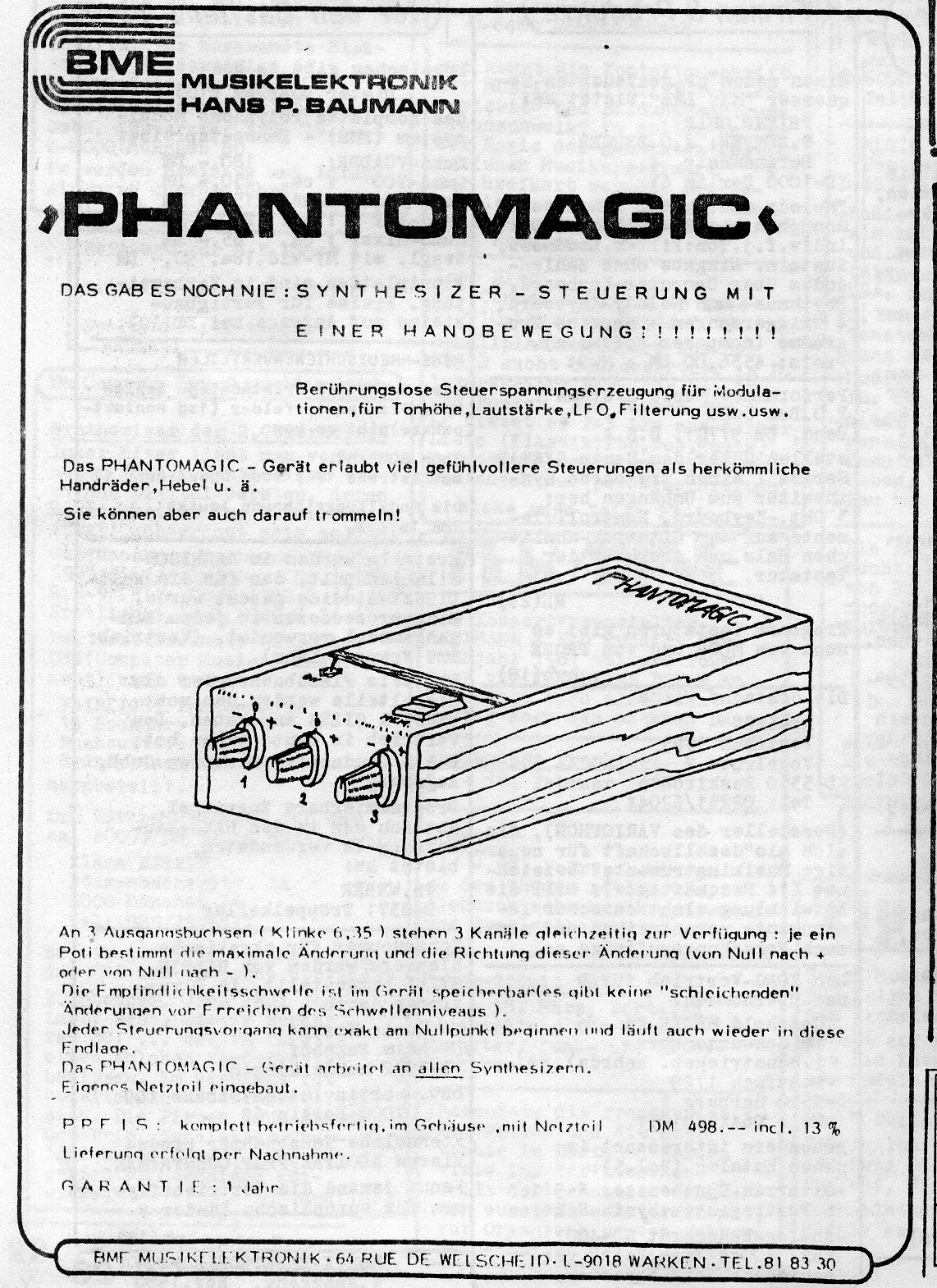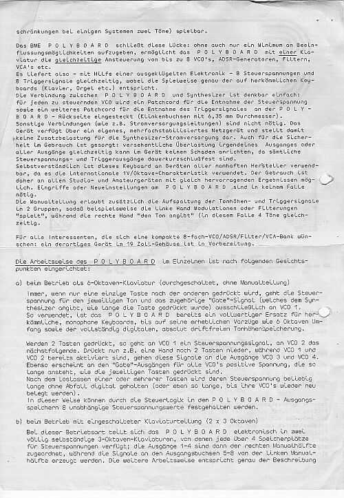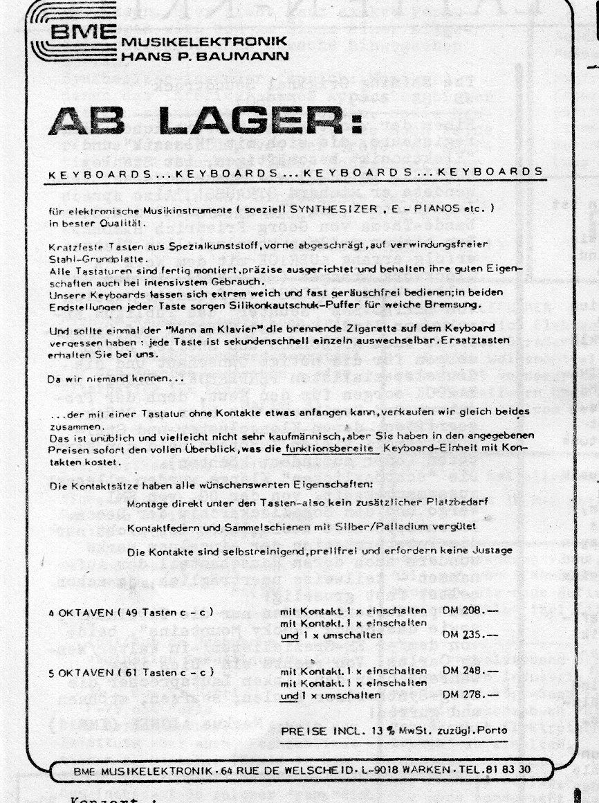 | Wir fuhren wieder nach Berlin zurück, mit heißen Köpfen und voller Enthusiasmus. Norbert hatte seinen Minimoog, Klaus sein PPG-Zeug ich aber wollte auch ein "richtiges Modulsystem" haben und kritzelte die Folgezeit auf jedem erreichbaren Stück Papier Anordnungen von Modulen, rechnete Einzelpreise zusammen, kurz: Ich war vom Modular-Virus befallen. Schon bald bestellte ich mir einige Module des PM-10 Modularsstems und baute nach und nach ein erstes, kleineres System zusammen. Die langen Lieferzeiten von BME waren schon damals eine beachtliche Nervenprobe aber es ging einfach nicht schneller, ich musste das einsehen und verteidigte diese Einsicht auch gegenüber Spöttern auch wenn ich mich selbst oft darüber ärgerte.. Kaum war das erste System soweit fertig, daß es vorführbar war, war auch schon der erste Synthy-Kursteilnehmer da, der das Ding sah, hörte, begeistert war und es unbedingt haben wollte - möglichst sofort natürlich. Ich ließ mich damals auch nicht lange bitten und verkaufte ihm das System. Unser gemeinsames Hobby fraß alles Geld auf, welches wir mit Artikeln für Zeitschriften, Testberichten für eine regelmäßige Rundfunksendung und durch unsere Synthesizerkurse erarbeiten konnten. Also wurden wir BME-Händler. Im Verlauf der Zeit baute ich so einige Systeme auf und verkaufte sie dann stets mit etwas Gewinn weiter. Alleine das Geld war es jedoch nicht, ich war, und das habe ich nie bereut, von den BME-Geräten überzeugt gewesen und habe sie schon deshalb gerne empfohlen - jedoch ohne jemandem etwas aufzuschwatzen! | ||